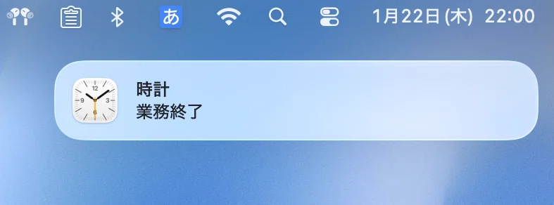 今は21時50分に「あと10分で業務終了」のアラームを鳴らし、22時になったら「業務終了」のアラームが鳴るようにしています。