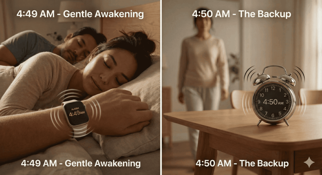 私はApple Watchを睡眠時にも装着していて、無音のバイブレーションのアラームを設定しています。時間になると、手首の振動で目が覚めます。