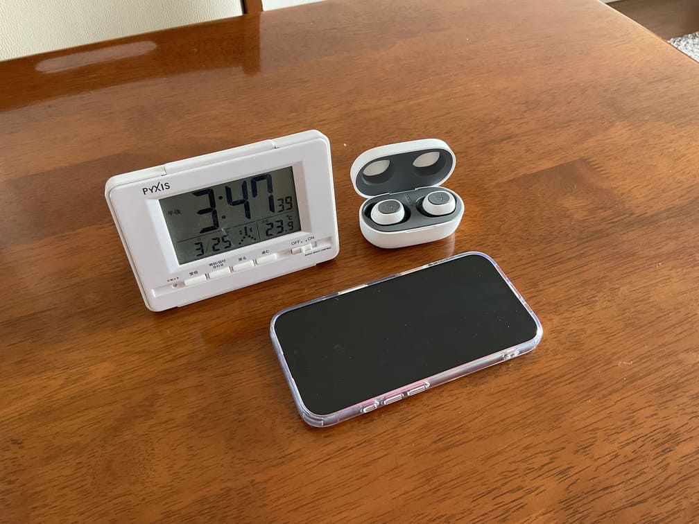 目覚まし時計を止めたら、すぐに隣に置いてあるイヤホンを装着し、スマホでながら聞きの音声を流します。最初は全然頭に入らなくても、耳で音が聞こえていたら、だんだん目覚めてきます。
