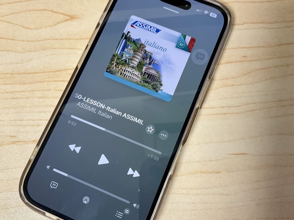 起きたら有無を言わさずBluetoothイヤホンを耳につっこみ、ながら聞きの教材をスマホで再生します。今はイタリア語を勉強しているので、スマホにダウンロードしてある音声を流します。