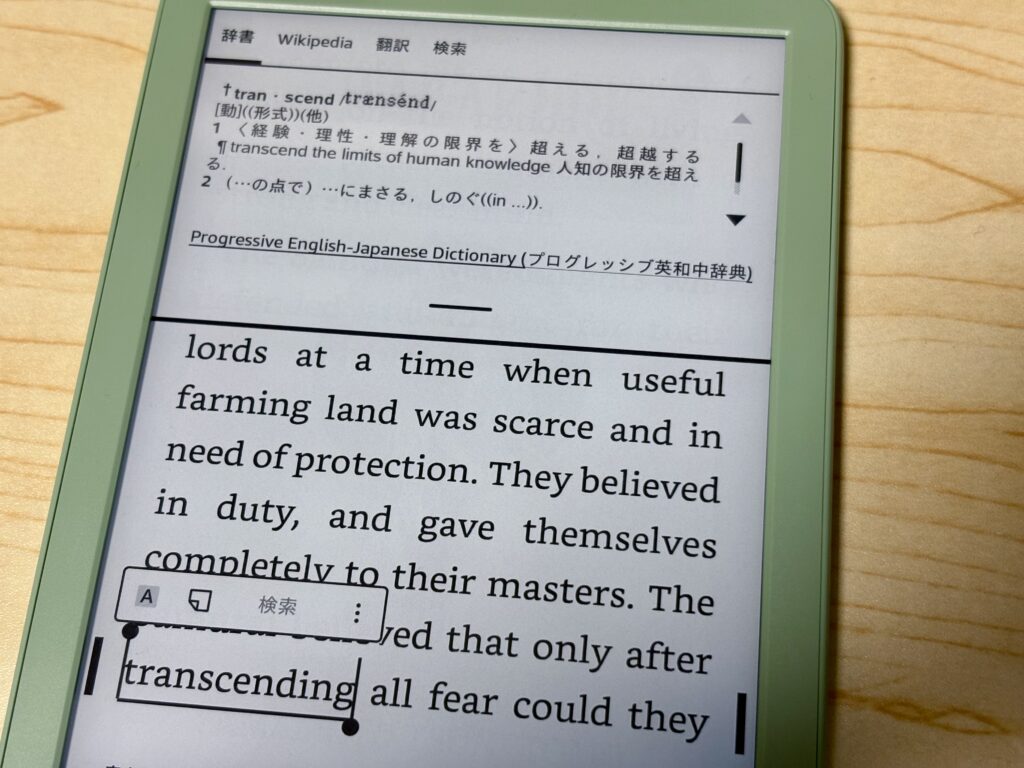 ご存知の方も多いと思いますが、Kindleなら知らない単語を長押しすれば、辞書で意味を調べることができます。