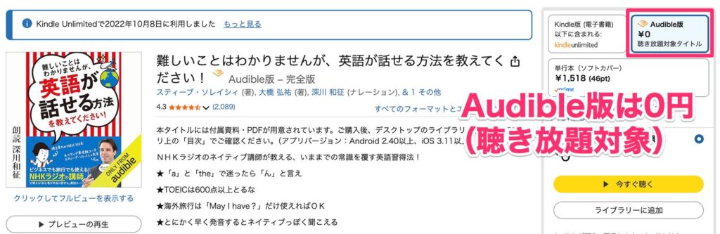 なお、原書(日本語版)もオーディオブックになっていて、こちらも聴き放題対象です。英語オーディオブックはちょっとハードル高いわ・・・という人は、日本語版オーディオブックをどうぞ。
