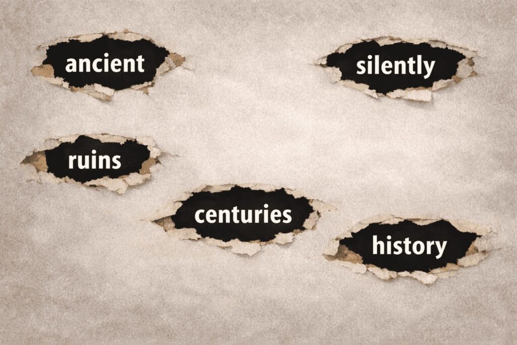 主語と動詞(The ancient ruins stood = 遺跡が立っていた)さえ聞き取れれば、後半の bearing witness to centuries of history で少々知らない単語が出てきても、遺跡が立っているイメージはできますね。