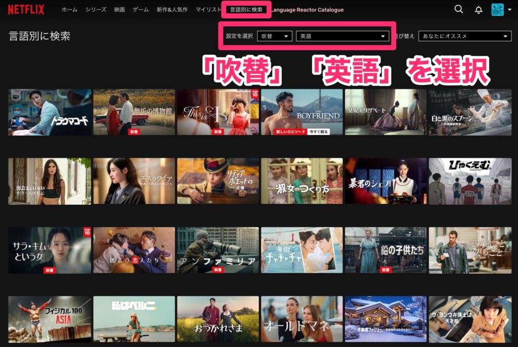 その上で、NetflixをPCで開き、ページの上部の「言語別に検索」→「字幕」「英語」を選択します。すると、英語字幕があるドラマと映画がずらっと表示されます。