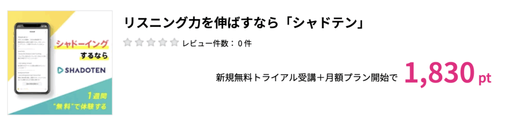 初めての方対象で、新規無料トライアル受講+月額プラン開始完了でポイントが獲得できます。シャドーイングの有名なアプリで、プロの先生に添削してもらえます。