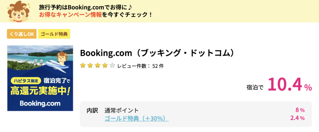 私が毎回の海外旅行の宿泊手配でヘビーユースしているのが、このBooking.comです。2025年のフランス旅行では、約35,000ポイント(35,000円)のポイントをゲットしました!