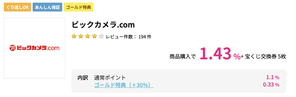 商品購入のたびに何度でもポイント獲得できるので、家電製品を買う時にはamazonではなくまずはビックカメラで探すといいと思います。(※amazonはハピタスポイントの対象外です)
