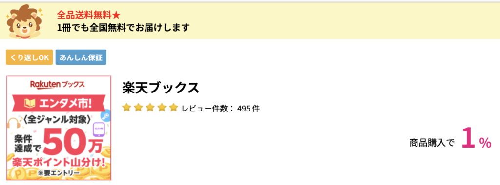 なので私は、いつもハピタス経由で楽天ブックスで買います!楽天ブックスって、前は「3,000円以下は送料がかかる」とかそんなルールだった気がしますが(思い違いかも)、今は1冊でも全国無料配送。