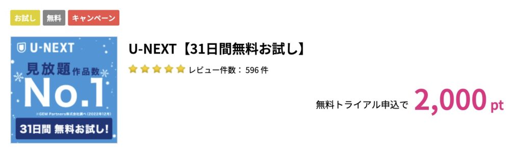 初めての方限定で、31日間無料トライアル申込でポイントがもらえます!試してみて合わないと思えば、有料会員登録しなくてもポイント獲得できるので、特におすすめです。