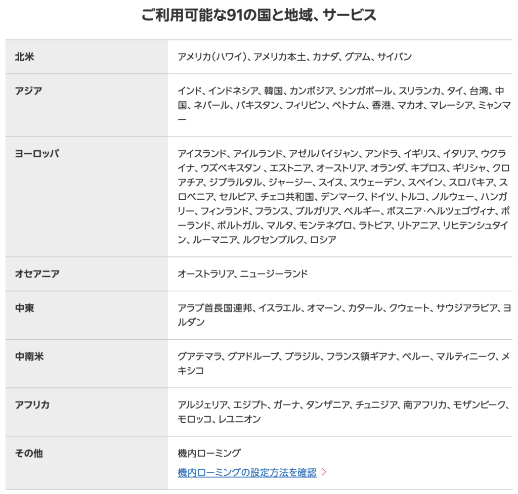 楽天モバイルがそのまま使える国は、以下の世界91カ国。日本人が旅行で行きそうな国は、ほぼカバーされています。