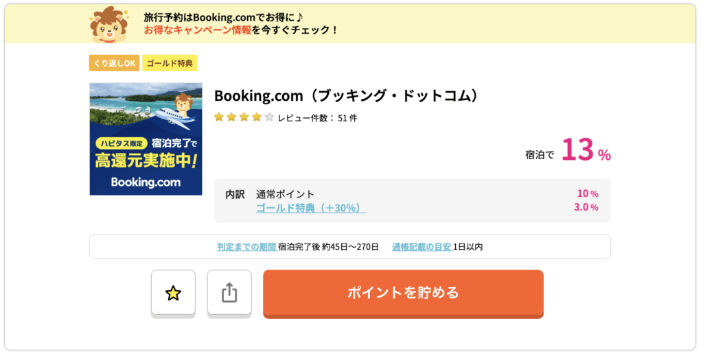 Booking.comはハピタス経由で予約するとポイントがつくので、さらに旅費がお得になります!